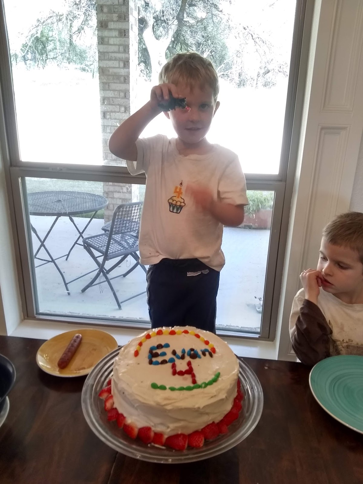 Evan is 4 years old! He was super excited for his birthday he talked about it for weeks and loved every minute of it when it was here! Evan wanted a chocolate cake with white frosting with m&Ms on top and strawberries.